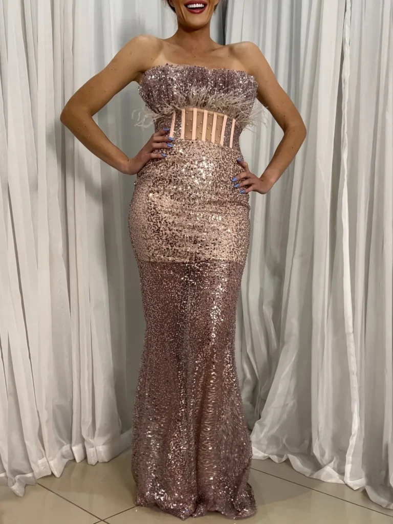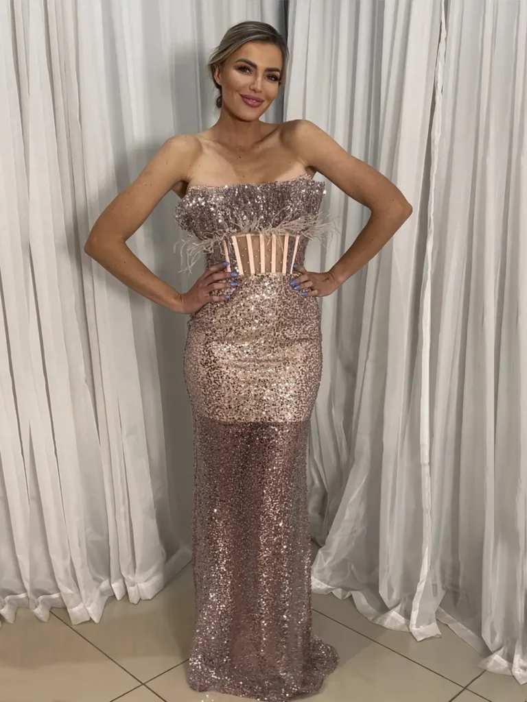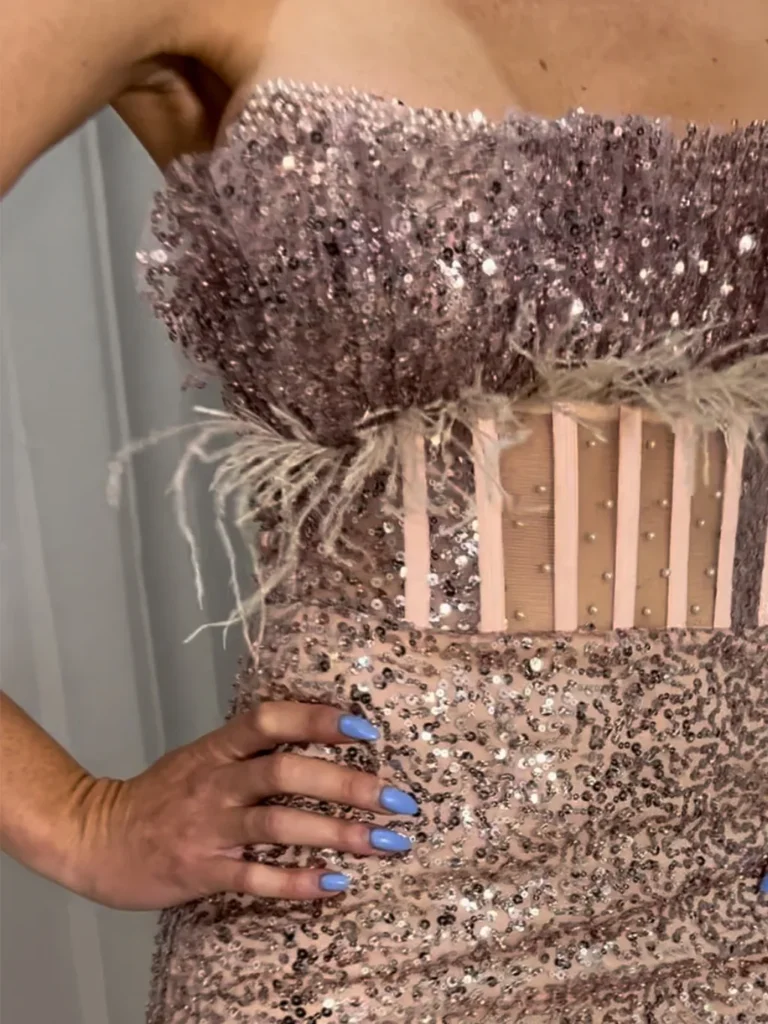 Straight from a fairy tale ballet, our “Blushing Swan” gown pirouettes into the spotlight in head-turning dusty pink, almost giving rose gold sequins! This show-stopping masterpiece features a dramatic strapless neckline that leads to a corset-style bodice, where delicate pearl-adorned mesh panels create an architectural masterpiece. The piece de resistance? A fluttering band of feathers that wraps beneath the bust like an ethereal ballet sash, adding that perfect touch of theatrical drama.