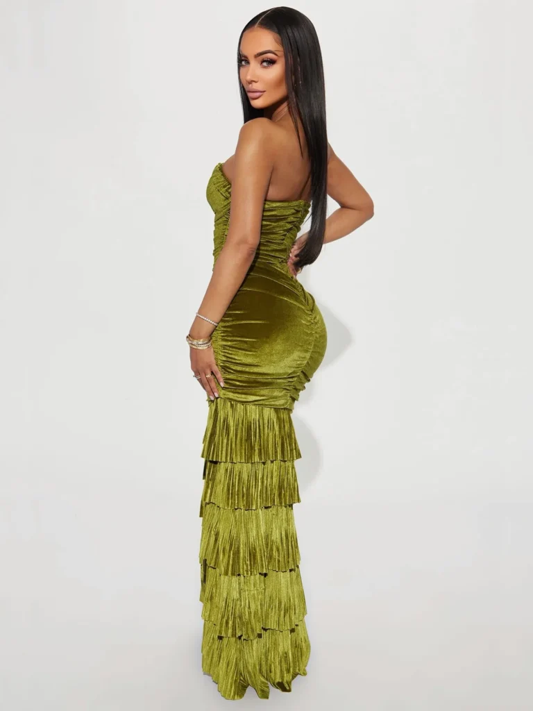The strapless design and rich olive hue provide a stunning canvas to showcase your shoulders and collarbone, while the hidden back zipper ensures a seamless, sleek silhouette. A daring side slit reveals just the right amount of leg, making this dress ideal for those who love to make an entrance.