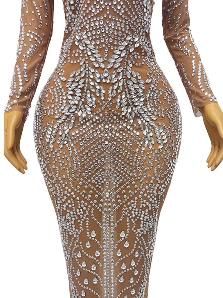 Featuring long sleeves also crafted from the same crystal-adorned mesh, this dress offers a perfect balance of coverage and sensuality. The seamless integration of the sparkling stones from bodice to sleeves creates a cohesive and dazzling effect.