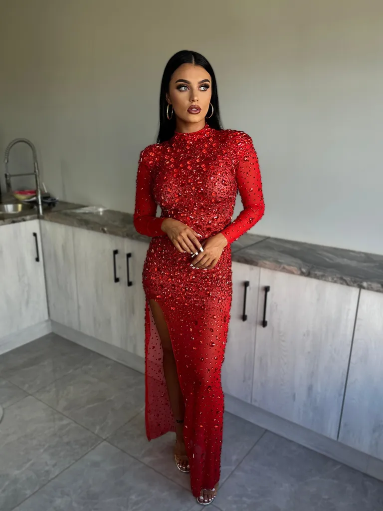 Be prepared to command attention in this masterpiece where each crystal has been thoughtfully placed to create a magnificent illusion of being caught in a spectacular rain of diamonds. This is more than a dress – it’s wearable art that transforms every entrance into an unforgettable moment.