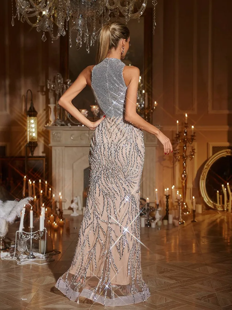 Transform into a walking masterpiece in our Enchanted Empire Dress. This show-stopping gown features a dazzling silver sequined bodice with an intricate crystal-embellished high neckline and striking cutouts. Below, shimmering silver beading cascades dramatically over nude mesh in mesmerizing waves, creating an illusion of liquid starlight flowing down to a subtle mermaid hem. The nude undertone adds an alluring dimension that makes the silver beading appear to float on skin. Perfect for red carpet moments, galas, or when you’re ready to rule the room in ethereal glamour.