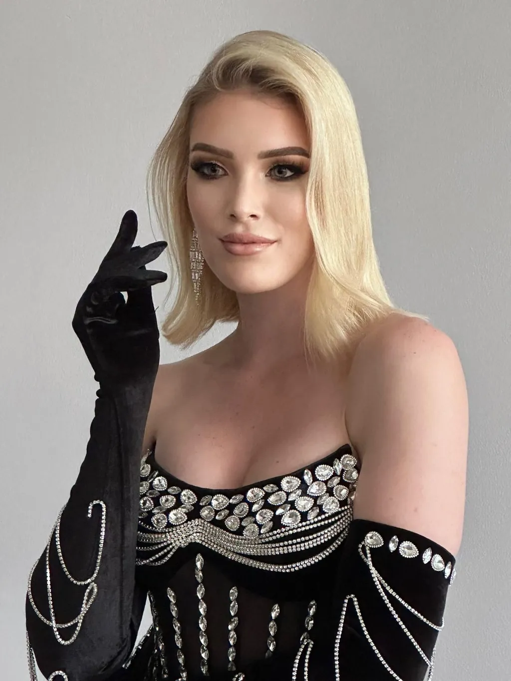 Dripping in crystalline luxury, the Expensive Taste gown is where old money meets modern drama. This noir velvet masterpiece features cascading crystal streams that transform you into a walking constellation, while the corseted bodice sculpts and the ruched skirt teases. Paired with matching opera gloves adorned with draped crystals, it’s giving main character energy with a billion-dollar plot twist. When basic black just won’t do, this is the dress that makes ATMs nervous and diamonds jealous. Perfect for those nights when you’re feeling expensive and acting priceless.