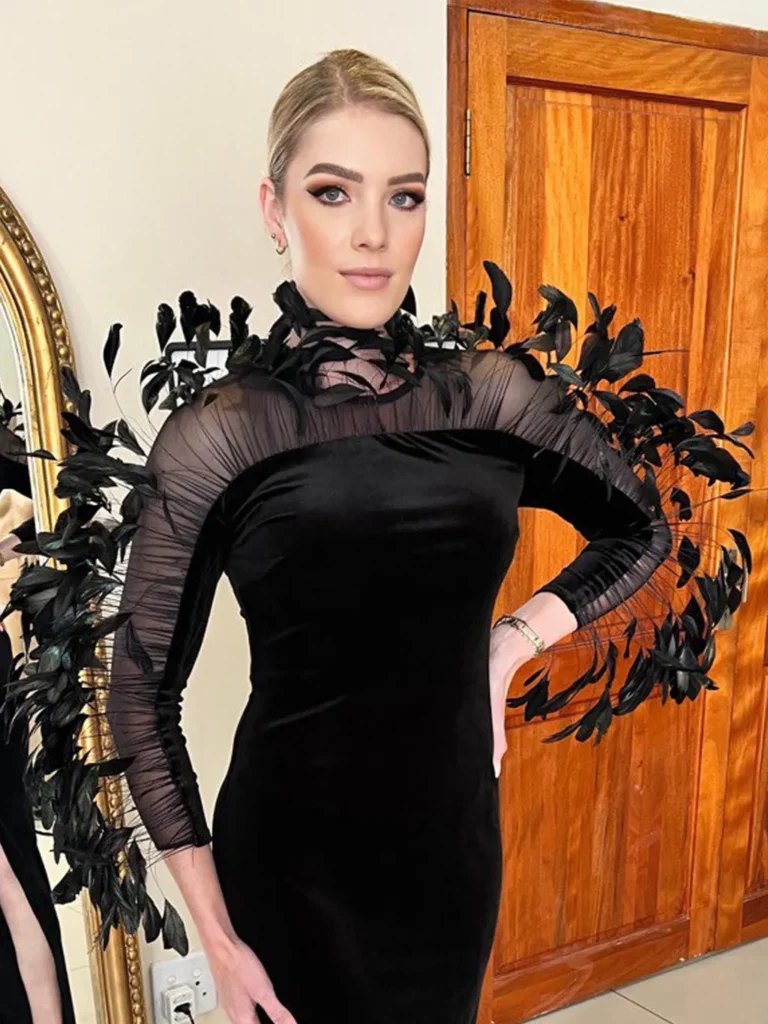 Meet “Feathered Fantasy” – where haute couture meets pure magic! This velvet vision commands attention with its sleek silhouette and show-stopping feather trim that frames you like nature’s most elegant crown. The delicately ruched sheer sleeves create an ethereal illusion, while those luxurious feathers dance along your shoulders like the most sophisticated choreography in fashion.