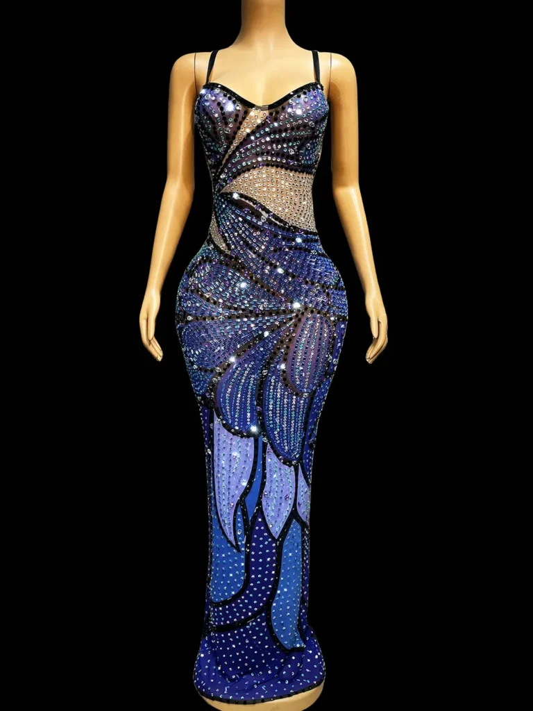 Make a stellar impact in this jaw-dropping gown that captures the magic of a meteor shower over deep ocean waters! The figure-hugging silhouette features a sophisticated sweetheart neckline with delicate straps and a dazzling array of crystals that cascade from bodice to hem like shooting stars. The strategic placement of stones creates a striking pattern in shades of royal blue, azure, and silver, while sheer mesh panels add an alluring touch of mystery. A showstopping back view ensures your exit is just as memorable as your entrance!