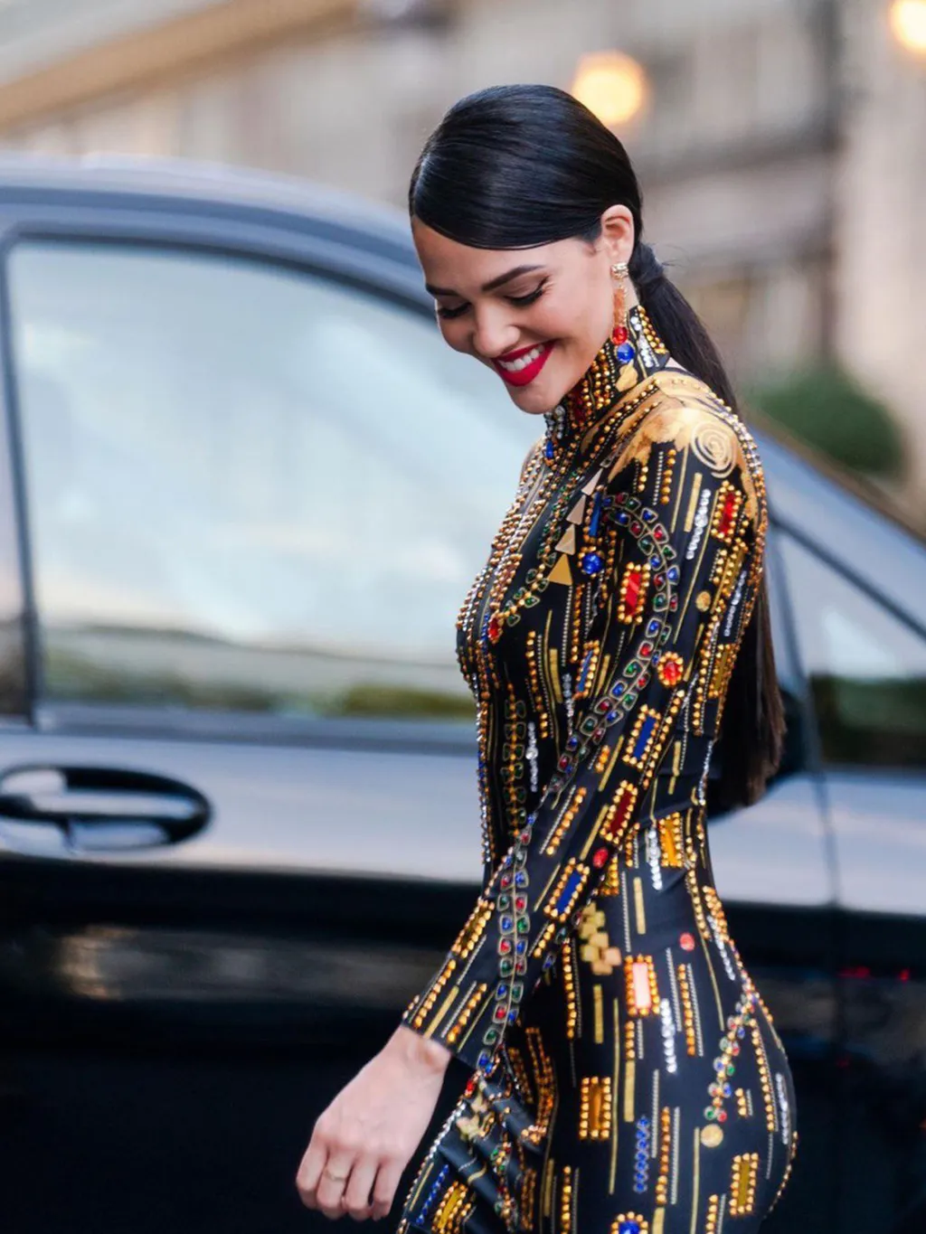 The high neckline, figure-sculpting silhouette, and alluring back slit create a silhouette of pure sophistication, while the long sleeves and luxurious length ensure every entrance becomes a moment of pure magic. Some dresses tell a story – this one writes history!