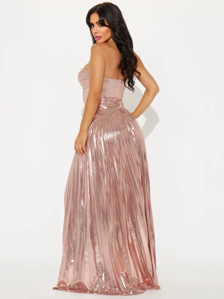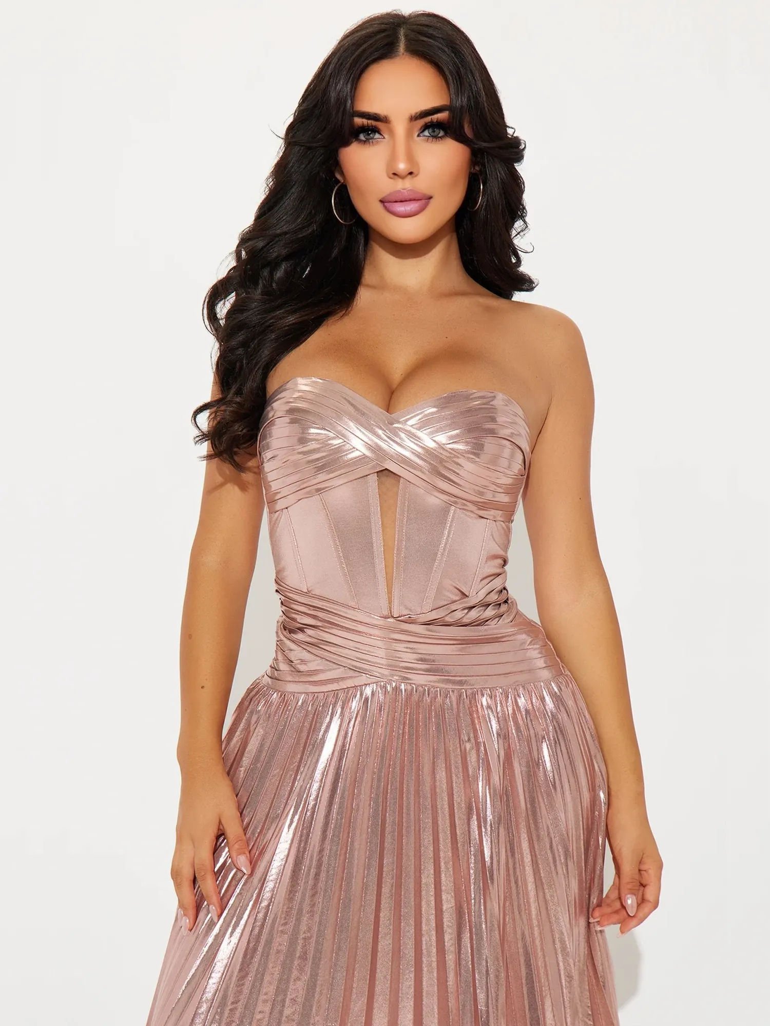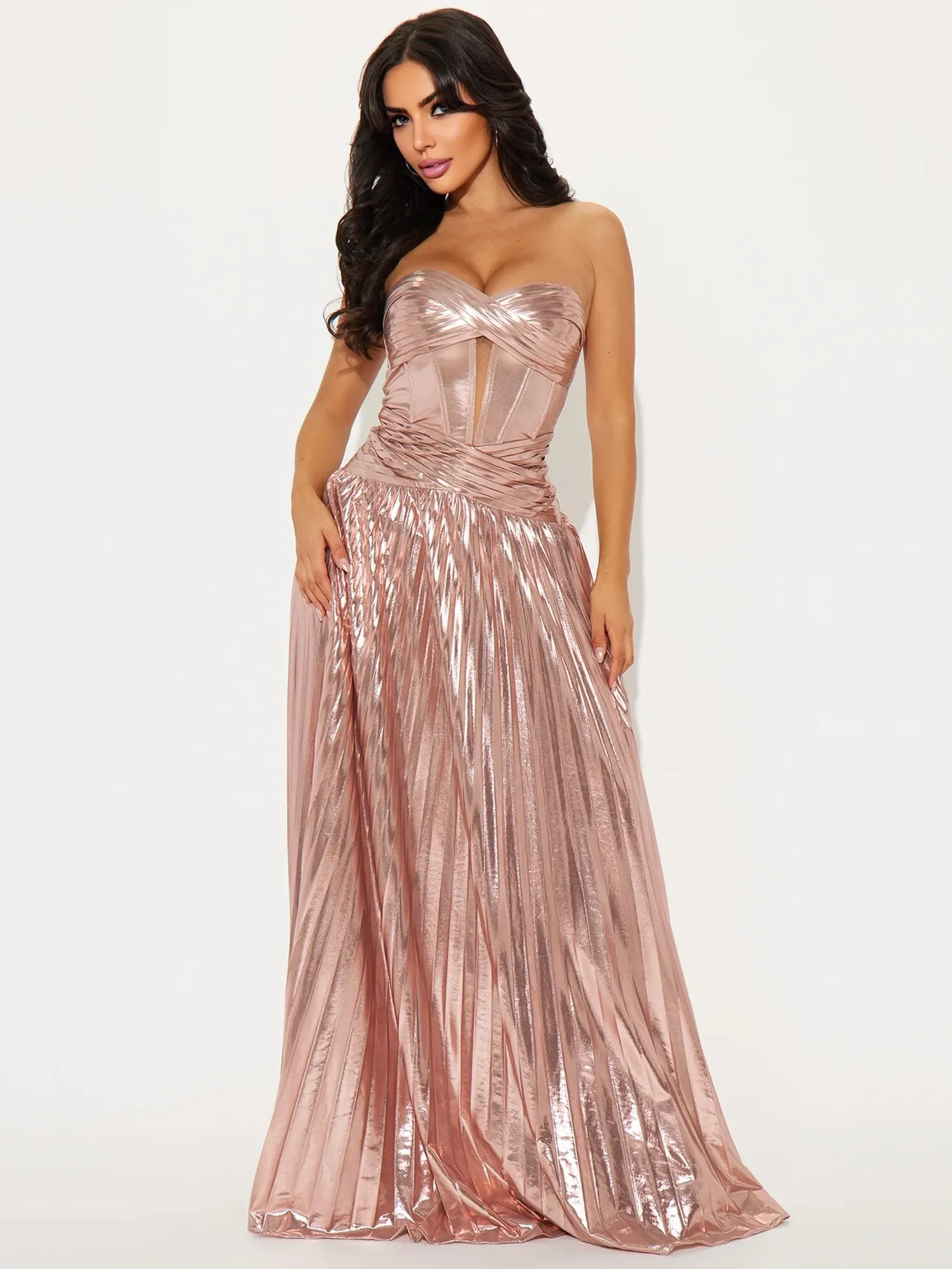 Pop the champagne in our showstopping Prosecco Pleat Dress, where liquid metallic dreams become reality. This stunner features a structured sweetheart corset that hugs every curve, with delicate optional adjustable straps ensuring the perfect fit for your grand entrance.