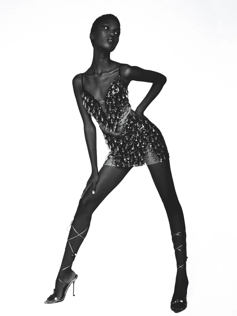 Embrace your inner starlet in the Purple Allure Mini Dress. This dazzling creation hugs your curves with a constellation of deep purple sequins, shimmering like twilight captured in fabric. Beautiful crystals hang down the bodice, creating an enchanting interplay of light and shadow. The plunging neckline exude confidence, while strategically placed sheer panels add an air of intrigue. Short and sweet, this dress commands attention with every step.
