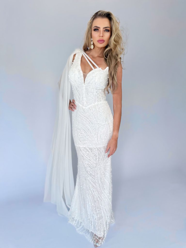 Picture yourself making that entrance – the asymmetrical neckline reveals just enough while the strategic cutouts whisper sophistication. The beadwork follows the natural lines of your body, creating curves that make you feel sculpted to perfection. But then you turn, and that flowing cape unfurls from your shoulder like a secret you’ve been keeping all night.